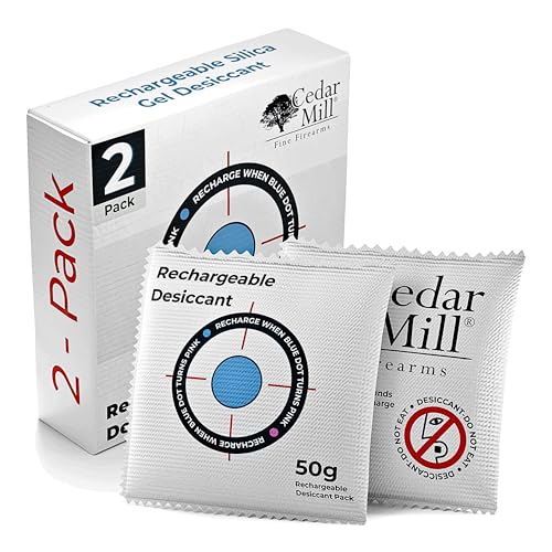 Firearm owners who demand reliable moisture protection without ongoing replacement costs will find Cedar Mill Fine Firearms’ reusable silica gel dehumidifier bags an ideal solution for their storage needs. These compact absorbers come in three sizes: 50g for pistol cases, 100g for rifle cases, and 250g for gun safes. You’ll appreciate their microwave-rechargeable design, which eliminates constant replacements while maintaining consistent rust prevention. The silica gel beads change color when saturated, providing a clear visual indicator for recharging cycles. With 194 customer reviews averaging 4.5 stars, these dehumidifiers effectively reduce humidity levels in confined storage spaces, though larger areas may require additional units for best moisture control.